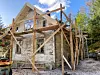 Stillas av heimeskoren material er sett opp rundt heile huset. Ludolf Birkeland, far til Tore, er leverandør av material til stillasbygging. Han driv sagbruk på hobbybasis heime på garden på Birkeland og tømmeret er henta frå eigen skog.