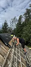Nokre skiferheller hadde opp gjennom åra falle ned frå taket ved naturmetoden. Rundt pipa var det tydelege spor etter lekkasje. Nå er heile taket i ferd med å bli nytt. Det er heva med seks-toms bjelkar oppå det gamle taket. Under det nylagde sutaket ligg isolasjonsmatter.