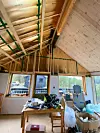 Vertsparet måtte investera i eit aluminiumsstillas på hjul for å kunna arbeida nokonlunde effektivt og trygt i høgda. Tatsiana seier at med bruk av gjennomsiktig lys beis på furupanelet, må ein vera nøyaktig og dra penselstrøka langs eit panelbord om gongen for at det skal sjå fint og jamt ut.