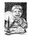 Fekk me så kvar vårt farga talgalys som me tende og sette på pulten. Til alt overmål fekk me tildelt kvar får fjerde-part av ei appelsin.