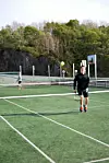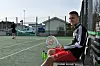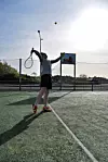Ballen går høgt opp i lufta. Det gjeld å slå hardt for å setja serven rett i det venstre hjørnet på motsett side av tennisbana der Joachim Grasdal Larsen ventar. Ein sving frå Anders Tendeland, og spelet er i gang.
