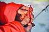 I tillegg til ulltråden, som han påstår bringer fiskelukke, bruker han reker som agn. Ei reke blir hukka fast, og for sikkerhetsskuld, bunden fast med ein raud tråstump ho også. Raud ull.