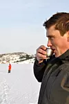 Kameraten Sjoerd Weterings er på isfiske for første gong.