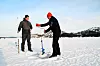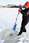 Fiskestengene er klar, nå manglar berre to hol til i isen.