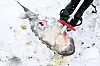 Holet i isen er klart. Han plumpar rekekroken nedi slushen.