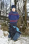 – Eg kan strikka med «strikkering», der kan eg strikka luer, seier Arne Martin Helland. Mormora har strikka den blå genseren han har på seg. Han har ein til heime óg.