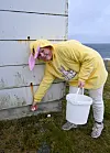 Kafevert Jenny Haldin var utkledd som påskehare saman med Maja Flage frå Saltveit, og her kunne egga vekslast inn mot noko søtt. Dei fortel at dei hadde tre bøtter med kokte egg.