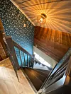 Den gamle, bratte trappa mellom etasjane blei riven og erstatta med ei ny svingtrapp laga etter mål. Ho står ein litt annan stad i huset og er langt mindre bratt enn den gamle.