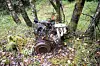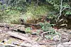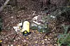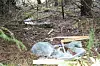 Byggmaterialar og ein haug med treverk ligg strødd til sida, med noko plast i ein dam bak. Ein godt rusta sykkel har nesten vorte slukt av mose og gras.