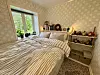 Vegg-i-vegg ligg to små soverom. Begge har plassbygde senger og dei originale kuppel-lampene frå fjøsen, fortel ho: