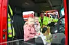 Jentene testet setene i den store brannbilen og fikk et lite innblikk i livet som brannkonstabel. Fra venstre: Ella Ureta Førde, June Natås Strand og Håkon Ureta.Foto: Morten Vågset Møller
