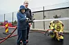 Markus Espevold Pedersen viste at han hadde godt tak på brannslangen og sa at han godt kunne tenke seg å bli brannmann når han blir stor.Foto: Morten Vågset Møller