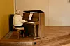 Liv Eidesvik Våge, som er ein av dei mange medlemene i strikkeklubben, speler piano under allsongen, men er òg ein aktiv strikkar.