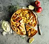 Eltes sammen til en deig, som kjevles ut og legges i rund form. Deigen lit større enn bunden i formen, så det blir en kant rundt. Fyll med epler eller annet syltetøy. Av deigen tas på forhånd lit som kjevles ut og skjæres i strimler, helst med bakkelsrenne, som legges over kaken på kryss og tvers (som på fyrstekake). Stekes i alminnelig varm ovn.