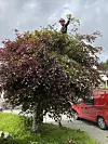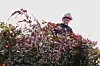 For fotografen nede på bakken kjem klatraren med raud hjelm og visir til syne først etter at han har kutta ned fleire greiner med frodig bladverk. Frå toppen av treet held han fram å kutta greiner kring seg og kastar dei ned.