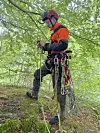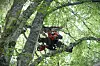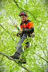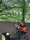 Mellom tett bladverk frå ein blodbøk i Førresfjorden, har han rigga seg til med tauverk og seletøy. I sitt innhaldsrike belte har han ymse verktøy som greinsag og ei lett motorsag. Eit dobbelt klatretau har han festa høgt oppe i treet.