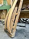 Når treet er tørka og kløyvd, brukar han øks til å hogge ut forma før han høvlar ned materialet. Skituppen blir først spikka til med kniv. For å få fram den karakteristiske bøygen, legg Gjelstad tuppen over ein dampande kjele med vatn ein times tid. Så låser han skia fast i ein mal med boge, som kan minne om framdelen på ein gammal trekjelke.