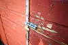 Låsen er ødelagt, og treverket rundt er slått i stykker.