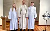 Konfirmantar Eikeland kapell 31.08.2025 kl. 11.00. Frå venstre: Ida Bjelland, prostiprest Roald Drønen, Wilhelm Jacobsen Mokleiv.Foto: Privat