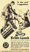 Det stripete eventyret starta allereie i 1937. Den gong skreiv dei lunsj med ch, trykte Freia-logoen i gull og reklamerte med at sjokoladen var like næringsrik som to skiver med smør og egg.