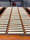 Svisj, svisj, seier det, når platene glir forbi og lèt etter seg ei overveldande, deileg duft. I teorien er det berre å strekke ut handa og fylle magen no. Det er sjølvsagt ikkje lov. Av hygieneomsyn er det ikkje lov å ete noko som helst inne i lokalet, seier strenge-Børre, medan han leiar an vidare innover mot emballasjeavdelinga der banda deler seg for innpakningar i ulike storleikar.