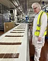 Børre Aamold løftar på høyrselsvernet og nikkar mot samlebandet, der rekkje på rekkje av rykande fersk Kvikk Lunsj susar forbi.