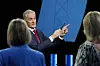 Finansminister og Sp-leiar Trygve Slagsvold Vedum og KrF-leiar Olaug Bollestad tok ein slags mellomposisjon ved å vifte med hendene sine.